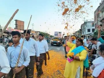 घाटमपुर नगर स्थित कुष्मांडा देवी मंदिर परिसर से दोपहर में आरएसएस की विराट पथ संचलन यात्रा निकली। गणवेश पहने कार्यकर्ता हाथों में डंडा लिए जयघोष करते निकले।